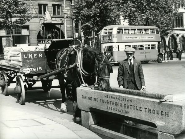 20世纪30年代,伦敦的马车和机动车交通。