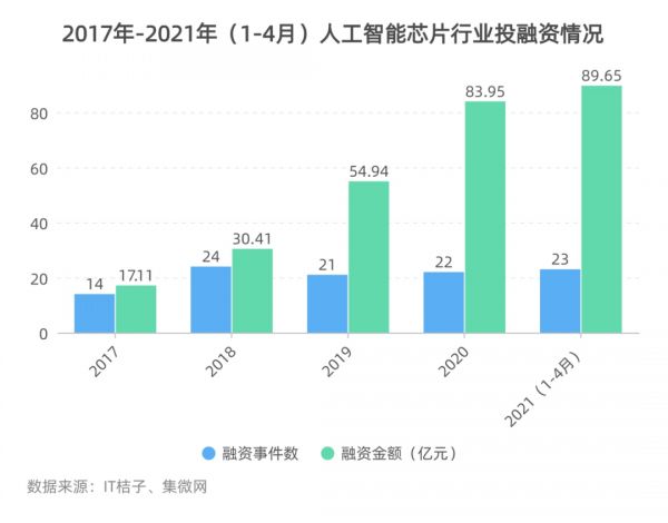 真金白银不断涌入。根据第三方分析机构集微咨询统计,仅2021年前四个月,中国AI芯片行业的投融资规模达到89.65亿元,涉及投融资事件20多起。