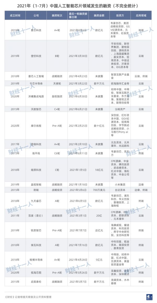 《财经》记者根据公开资料盘点了2021年获得融资的AI芯片公司,发现这些公司大多都是2018年之后成立,已有2-3年的成立时间。