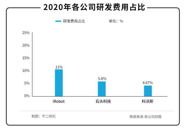 对比同行业,据各公司2020年财报显示,iRobot、石头科技的研发费用总额占营业收入总额的比例分别为11%、5.8%,均高于科沃斯。