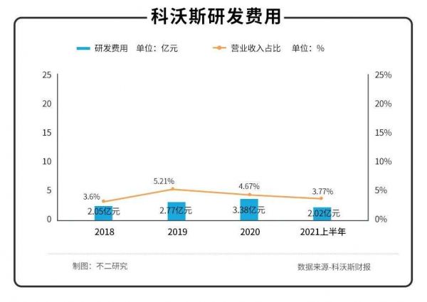 2021年上半年,公司研发费用2.02亿元,占总营收的3.77%,研发费用投入比例持续走低,仅比2018年3.6%的研发投入高出0.17%。