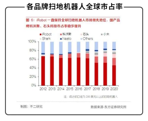 根据东方证券研究所数据显示,2020年,iRobot的全球市占率达46%,仍是全球扫地机器人的领军企业;同期,科沃斯、石头科技全球市占率分别为17%、9%,位列世界第二与第三。此外,包括小米在内的国内品牌也在逐步抢占海外市场。