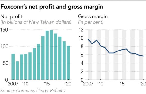这些举措正值消费电子利润下滑之际。富士康去年的销售额仅增长0.3%,净利润自2017年以来一直在萎缩。如果富士康要把毛利率从目前的6%提高到10%的预期目标,电动汽车势必成为关键所在。对于电动汽车项目的乐观预期推动富士康股价在3月份创下近4年来的新高。虽然股价随后有所下跌,但今年以来的累计涨幅依然超过15%。足以见得,电动汽车项目的成败与否事关重大。
