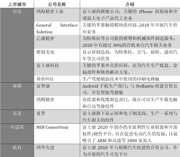 富士康的子公司已经为宝马和特斯拉等许多传统和电动车企供应电子元件,包括中控显示屏、印刷电路板、机械和塑料零件等等。