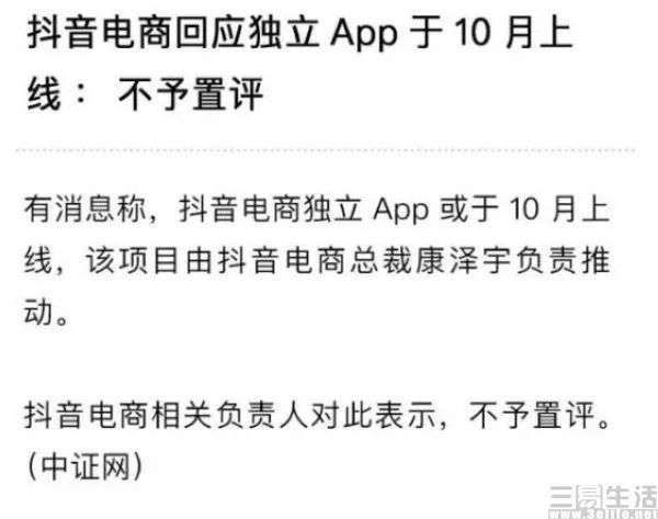 对于这一消息,抖音电商相关负责人对此表示,“不予置评”。尽管官方并未证实这一传言,但事实上抖音要做独立电商APP这件事,却并非空穴来风,而早在今年4月就曾有类似消息传出,而当时康泽宇的回应则是,“各种形态我们也不排除去尝试,但是独立APP我们确实没有定论。”
