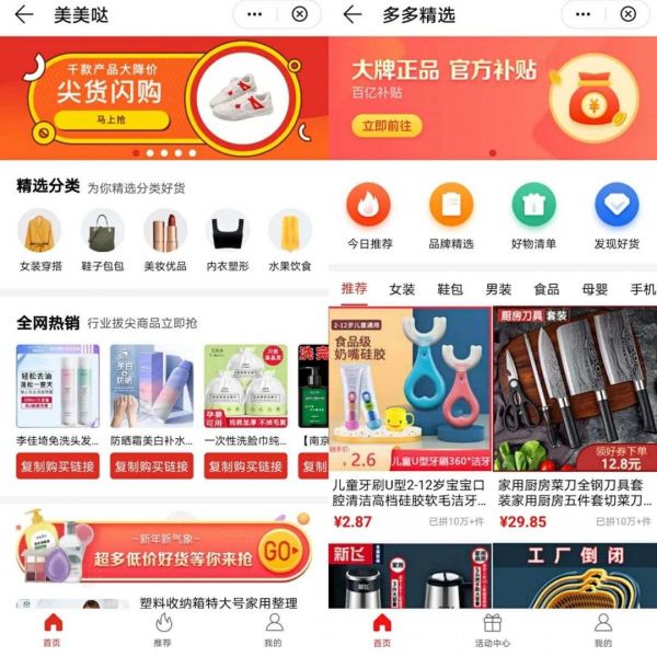 和目前还在运行的“多多精选”相比,后者有18个商品品类分布,美美哒更聚焦,选择的几个品类都是女性用户商品,导向更明确。相似点在于,两者都以卖货为导向,缺少主站拼团、社交裂变的玩法。