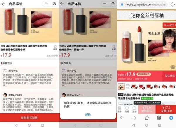 体验后发现,在美美哒上购物,购买路径较长:选中商品后,需要复制购买链接,在浏览器里打开,显示的才是拼多多上的商品详情页,然后再跳转到拼多多APP进行购买。如果没有下载APP,则会提示你进行安装,更像是为主站做外部引流。