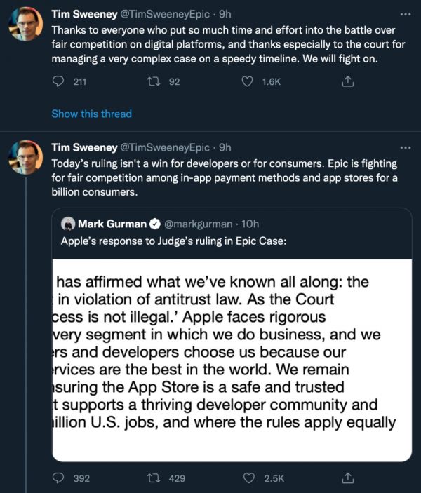这样的结果对 Epic 来说仍然不够完美,公司 CEO Tim Sweeney 在推特上表示:「今天的判决对开发商或消费者来说都不算是胜利。」