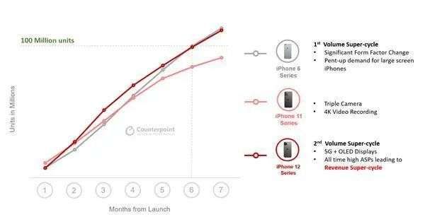 数据显示,去年第四季度iPhone 12的销量甚至破了苹果近五年的纪录。而Counterpoint Research的报告数据显示,iPhone12系列上市7个月,销量就突破1亿台大关。这也帮助苹果在去年第四季度击败三星,成为全球智能手机销量第一。