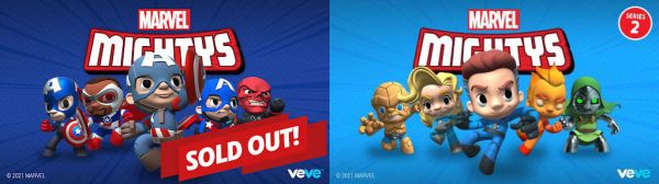 8 月 17 日,他们又开售Marvel Mightys #1 - 美国队长,5 位美国队长角色的 40000 多件NFT在 15 分钟内就以每件13 美元的价格售罄。本周末,Marvel 和VeVe又推出了 Marvel Mightys #2 - Fantastic Four,售出数千个 13 美元的“盲盒”——也即是买下来之后你才知道买到的是什么角色。