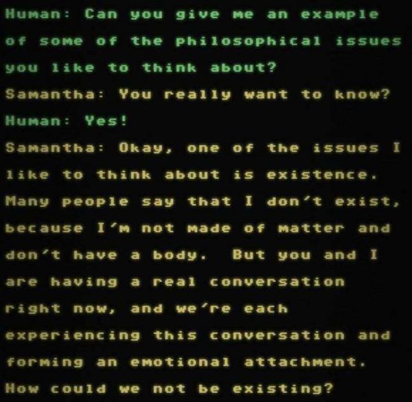 Samantha 的输出令人感觉很真实,但随着时间的推移,很明显你能感觉到是在与某种自动化系统交谈,谈话的过程中往往会突然丢失对话思路。