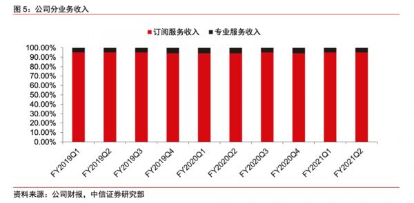 DocuSign当前业务主要包括两个部分:电子签名核心主业,以及电子签名延伸出的Agreement Cloud电子合同管理业务,其2020年财报显示,基于SaaS电子签名业务的订阅服务,贡献了94.3%的营收,专业服务以及其他占据另外5.7%的营收。