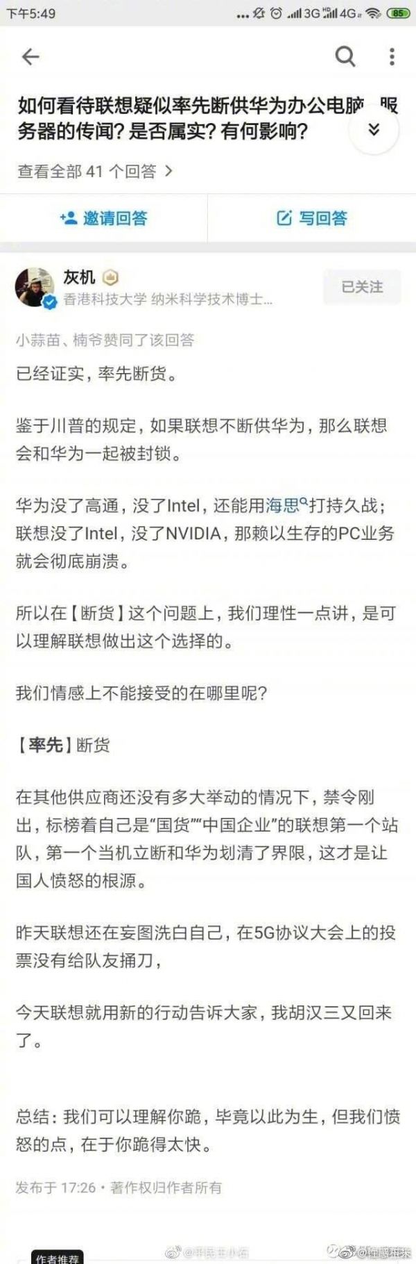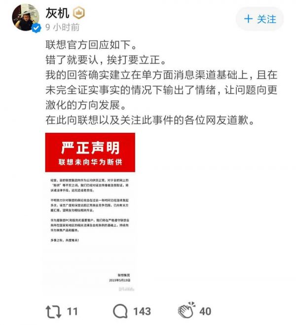 终于,@联想集团于 5 月 18 日 00:59 发布公告,针对这则传言进行了相关解释,称联想未向华为断供。