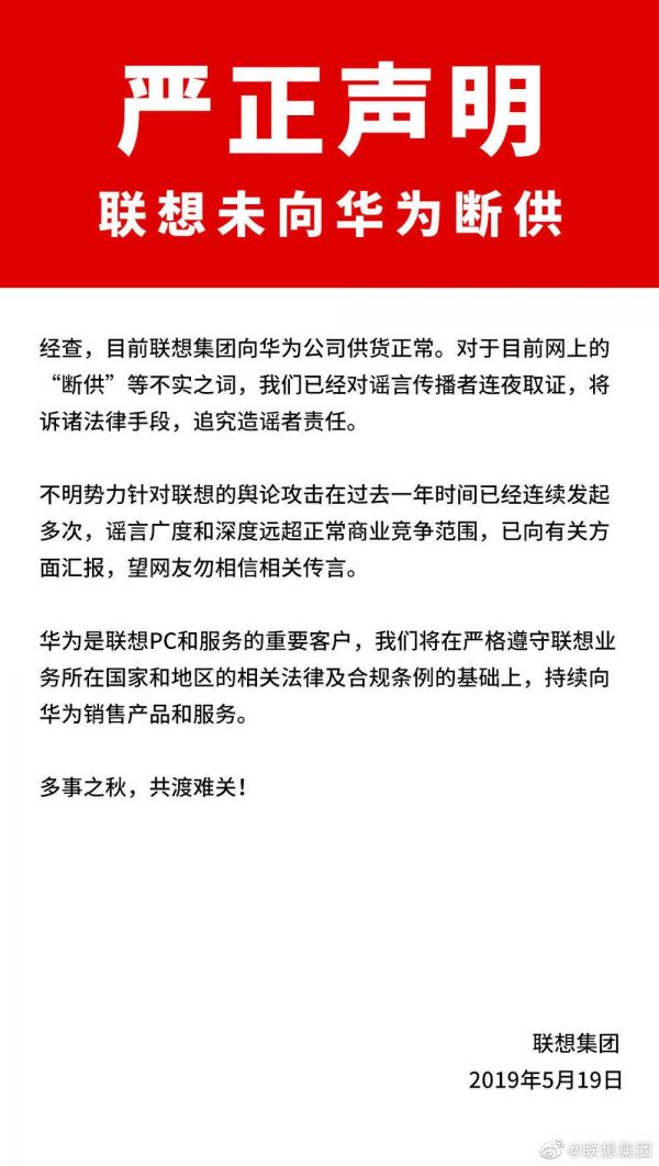 联想集团表示,华为是联想 PC 和服务的重要客户,我们将在严格遵守联想业务所在国家和地区的相关法律及合规条例的基础上,持续向华为销售产品和服务。另外,对于目前网上的“断供”等不实之词,已对谣言传播者连夜取证,将诉诸法律手段,追究造谣者责任。
