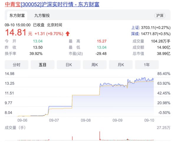 不过,这也引起了市场的关注,中青宝当日股价直接涨停。同花顺iFinD数据显示,9月7日至9月9日三个交易日,中青宝累计最高涨幅超70%。