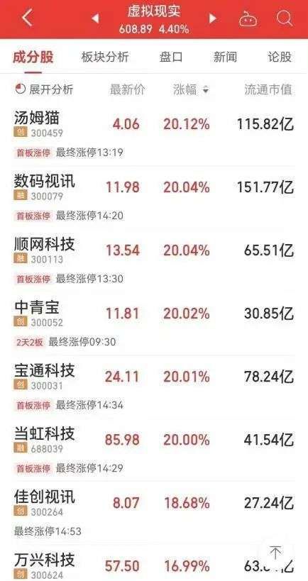 9月8日,多家元宇宙概念股涨幅超5%,其中,中青宝、汤姆猫、数码视讯、顺网科技、宝通科技、当虹科技等公司股价当日涨幅约20%。