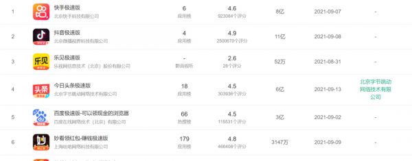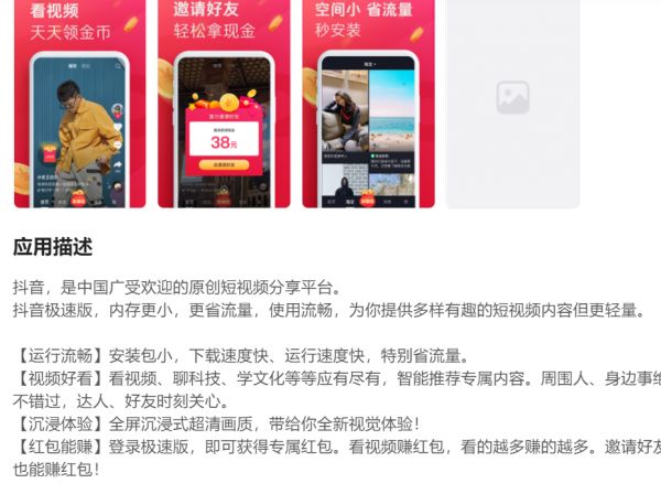 与此同时,部分应用的极速版一开始主打的其实就不全是轻量化,而是在原版应用之上做的差异化产品。如抖音极速版,应用突出的不仅是省流量、小安装包和运行速度快等属性,另一大特点是“看视频赚红包”功能。