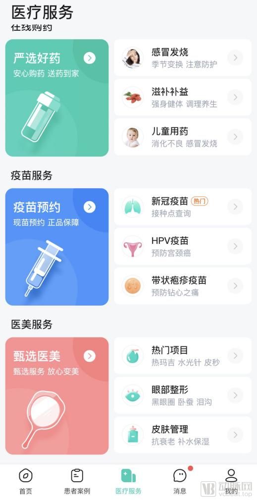 再者,在“医疗服务”板块包含了“在线问诊”、“在线购药”、“疫苗服务”、“医美服务”、“癌症筛查”、“临床招募”六个部分。
