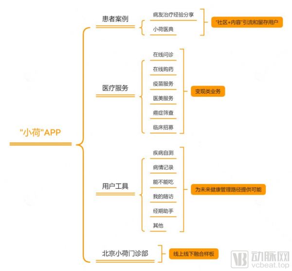 于是回到业务方向,“小荷医疗”整体业务主要可以归纳为“患者案例”、“医疗服务”、“用户工具”三个大的板块,下面将进行详细分析。
