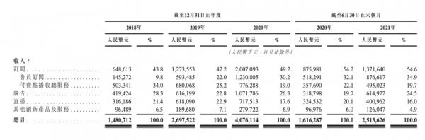 喜马拉雅创收主要靠订阅、广告、直播、其他创新产品及服务五块业务,其中包含会员订阅及付费点播的订阅收入占半壁江山。根据招股书,其2018年、2019年、2020年的收入分别为14.8亿元、27.0亿元、40.7亿元,2021年上半年收入为25.1亿元,同比增长56%。