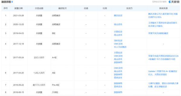 2016年7月,笑果文化获得来自王思聪普思资本的天使轮融资;2017年4月,完成1.2亿元A轮融资;2017年5月,又宣布完成A+轮融资,领投方为天图资本,华人文化、游族文化、南山资本跟投。2019年4月,完成新一轮工商变更,注册资本金从183万元增加为189万元,新增投资人南山星曜和天图东峰,二者亦参与了A+轮融资。