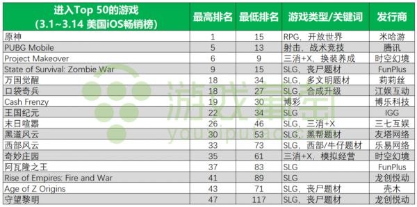 整体数量最多的时候,美国iOS畅销榜Top 10以内国产手游有5款左右,Top 50里多达16款,这算得上是过去很难想象的盛况。而随着一些出海RPG更新换代,说不定下次我们再来统计具体的品类情况,这样的表格里就会是另一番光景了。