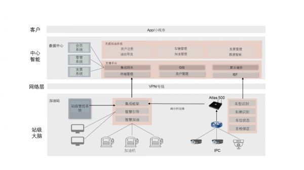 最底层是站级大脑,将基于昇腾AI处理器的Atlas 500智能小站和加油站的管控系统进行框架级集成;中间层是中心智能,以数据中心的形式打通了会员系统、发票系统、零管系统等,并定制研发了用户管理、车辆管理、加油管理等服务;最上层是用户体验层,通过APP和小程序进行车辆注册、发票申请、免密支付等功能。
