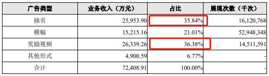 值得注意的是,互联网营销收入(即线上移动应用业务的广告收入)达7.24亿元,占营业收入78.96%。从具体广告类型来看,插页和奖励视频收入占比最高,合计占比达72.22%。