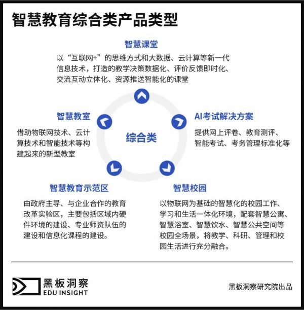 综合类上,主要有智慧课堂、AI 考试解决方案、智慧教室、智慧校园和智慧教育示范区。