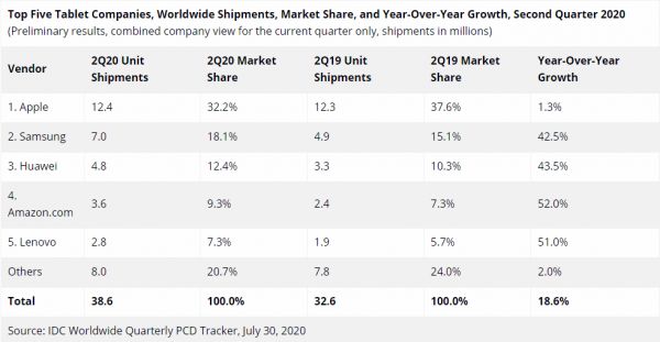 促使各家都纷纷盯上平板电脑的一个直接诱因是,市场销量爆发了:苹果iPad机型生产订单上半年增加了20%;三星、华为、亚马逊和联想等排在苹果之后的四家,同比增幅均超过了40%。