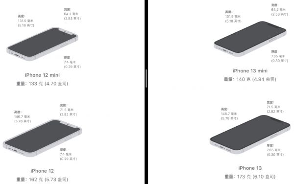 单从纸面参数来看,iPhone 13两款新机增加的厚度基本可以忽略不计,最多相差11克的重量,实际拿在手中也很难感知到。