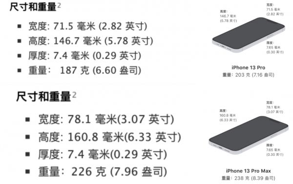 至于iPhone 13 Pro系列两款新机,厚度和重量也都有些许提升,但基本上也是可以忽略不计。
