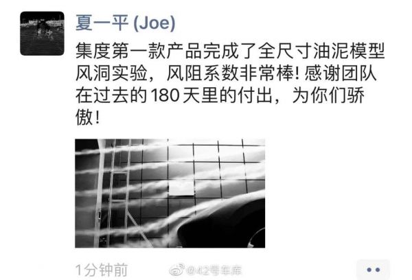 集度汽车于 3 月 2 日正式注册成立,与小米汽车算是前后脚。但是在上月底,CEO 夏一平在朋友圈表示,集度汽车的首款车型已经完成了全尺寸油泥模型风洞实验,而这距离他们成立仅仅过去 180 天。
