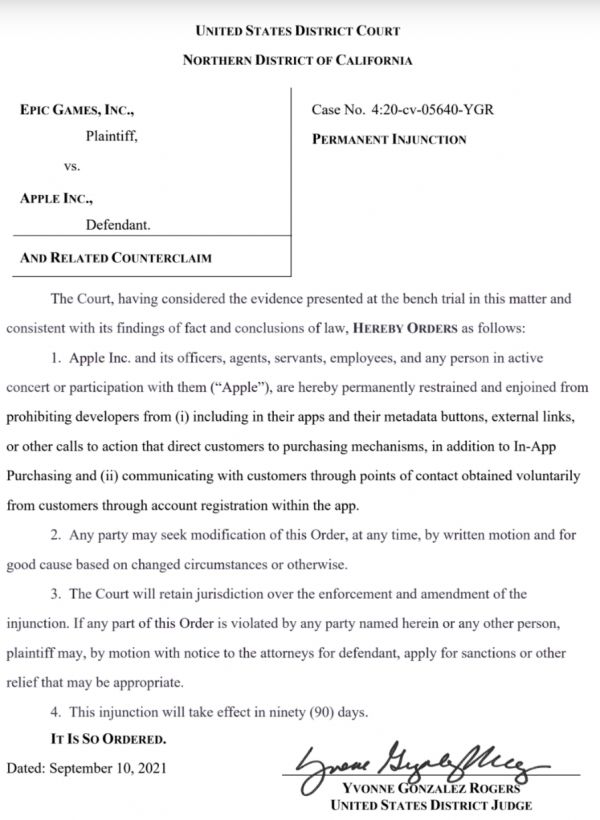 1. 特此永久禁止苹果公司及其官员、代理人、雇员和任何与其积极配合或参与的人(“苹果公司”)限制或禁止开发者(i)在其应用程序及其元数据中放置按钮、外部链接或其他行动呼吁来引导客户至应用内购之外的购买机制以及(ii)通过客户在应用程序内注册账户而自愿获得的联系方式与客户沟通。