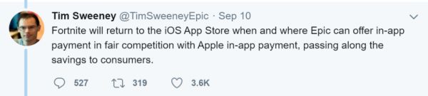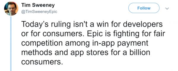 Epic总裁表示,法院的判决“对开发者或消费者来说都不是胜利”,Epic 不会将Fortnite带回 iOS,直到“Epic提供与苹果AppStore应用内购公平竞争的应用内购,并将剩下的钱还给消费者”,并表示他们将继续就此事提起诉讼。事实上,在9月12日,Epic确实已向第九巡回法院提交了上诉通知,质疑罗杰斯法官关于苹果不是垄断企业的结论。
