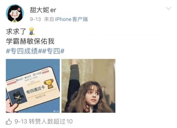 在某些高转赫敏帖的下方,你还能不时看到前来还愿的用户。他们说,就是因为转发了赫敏的画像,才让自己通过了考试、收获了爱情,各位兄弟姐妹们一定要来试试。