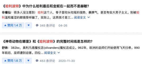 目前知乎上关于哈利·波特的热点讨论中,有“谁是哈利波特历史上最强魔法师”“成年之后再看哈利波特,有哪些和童年不同的认识”这类宏大历史观的问题。