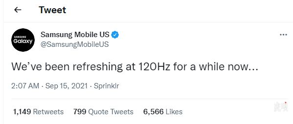 一个小插曲是,针对此,三星移动美国官方推特@Samsung Mobile US随后发推称“我们支持120Hz高刷已经有阵子了……”去年3月,三星已有手机搭载120Hz高刷屏。