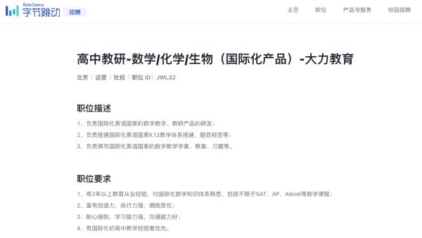 “双减”政策落地前,大力教育便在招聘国际化业务负责人、海外数学老师等职位,针对海外英语国家K12数学教学、教研产品的研发,同时也在招西语、葡语的数学教研实习生。