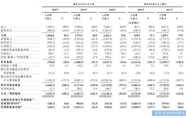 若剔除优先股等非经营表现项目,2018-2021上半年,商汤科技调整后亏损分别为2.21亿元、10.37亿元、8.78亿元、7.26亿元,三年半累计经调整后亏损28.62亿元。