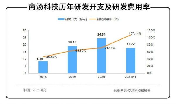 据商汤科技招股书显示:2018-2021年上半年,商汤科技研发投入分别为8.49亿元,19.16亿元,24.54亿元,17.72亿元;研发费用占营收比例分别为45.80%,63.30%,71.11%,107.14%。