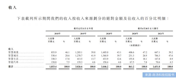其中,占商汤科技收入比例最大的是智慧商业和智慧城市业务。据招股书显示,2018-2021年上半年智慧商业占商汤科技营收比例分别为46.10%,39.80%,43.10%,39.20%;2018-2021年上半年智慧城市收入占其营收比例分别为28.60%,41.90%,39.70%,47.60%。