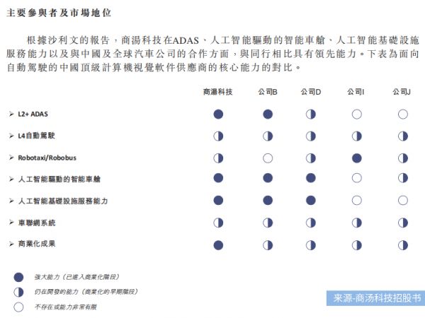 据沙利文报告显示,商汤科技在ADAS、人工智能驱动的智能车舱、人工智能基础设施服务能力等方面与同行相比具有领先能力。