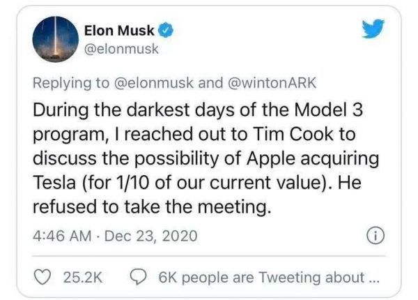这个版本的故事让马斯克非常愤怒,他在2020年底的一条推文中重新讲述了当时的故事:他在Model 3项目的至暗时刻曾试图接触库克,探讨苹果收购特斯拉的可能性,但库克拒绝见面。