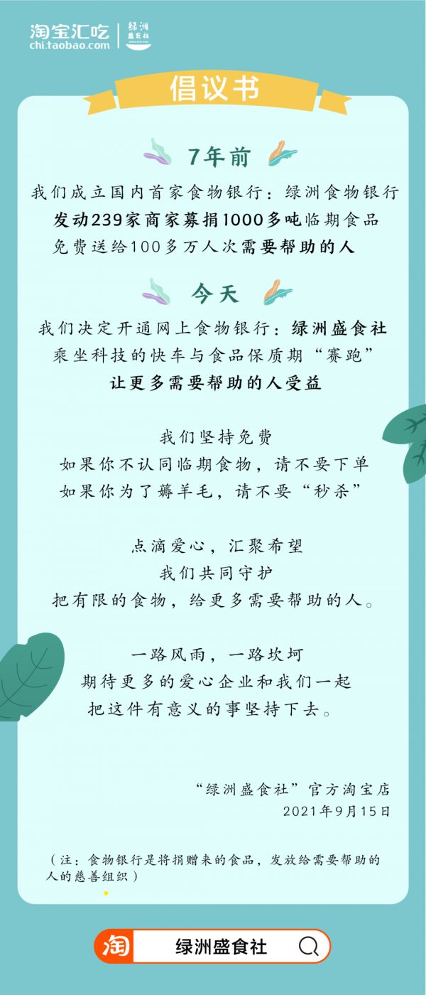 而临期食品,也将像二手商品一样,迎来它又一次的”黄金生命期“。同时,作为国内唯一被世界食物银行认证的分支机构,绿洲食物银行此次借助淘宝探索线上食物公益新模式,在全世界范围内都有示范意义。