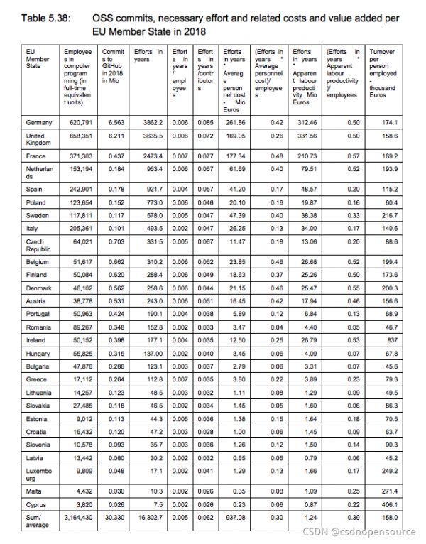2018年,开源软件经济的影响力在650亿至950亿欧元之间,个人贡献者超过26万人,占到欧盟计算机编程行业总数(310万)的8%。数据表明公司越小对开源软件的贡献就越大,在一份最活跃的开源软件公司样本中,员工数量少于50人的公司几乎完成了一半的提交。研究估计,截止到2018年,开源软件对于欧盟GDP的贡献以及欧盟开发者对于开源软件的贡献,产生了略高于1:10的投入回报率,考虑到26万欧盟贡献者的成本,最终的投入回报比仍然略高于1:4。