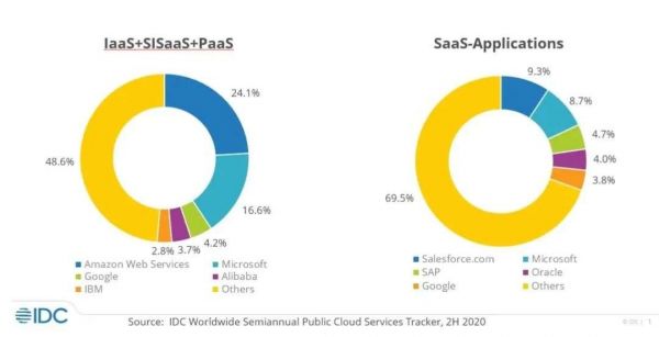 根据IDC《全球半年度公有云服务跟踪报告》,2020年全球云计算市场同比增长24.1%,收入总额达3120亿美元,亚马逊以24.1%的市场份额继续傲视群雄,微软和谷歌以16.6%和4.2%的市场份额分列二、三位,阿里巴巴3.7%的占比排名第四,IBM则以2.8%守住第五名。