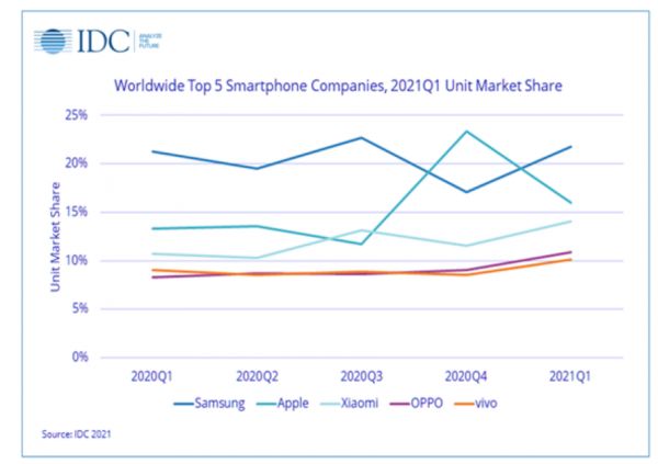 2021年初,IDC公布的全球智能手机份额显示:苹果第四季度出货量飙升了22%,占据了全球智能手机市场23.4%的份额。这让苹果市占率从第三季度的第4,跃升至榜首。