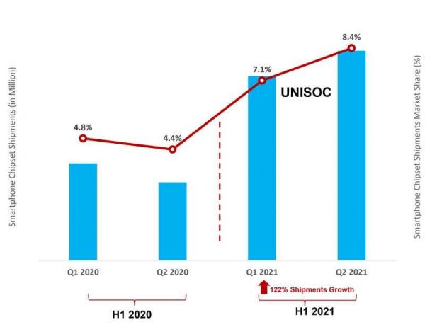 8月,据市场调研机构counterpoint最新数据也显示,全球智能机市场,展锐Q2占有率达8.4%。排在展锐前面的,正是高通、联发科、苹果、海思。2018、2019年,展锐在counterpoint 的统计中,还是被归为”others”的,但2020年开始被单独统计,为4%,2021年第二季度增长到8.4%,可以说是连续翻翻增长。