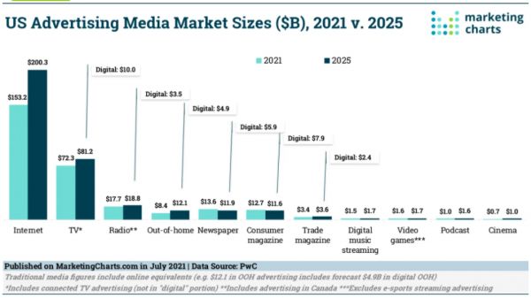 经历了一年多的动荡之后,几乎所有广告市场——尤其是互联网、数字音乐流媒体、视频游戏、播客,都出现了下降的趋势,不过大多数广告市场开始出现复苏的趋势。普华永道最新发布的《全球娱乐与媒体展望报告》,全面预测了2021-2025年美国线上和线下媒体广告市场的发展趋势。